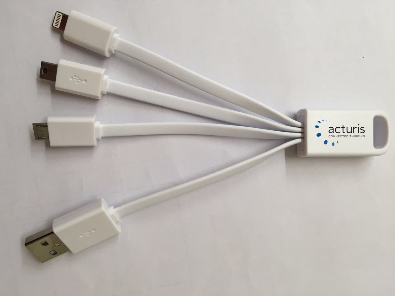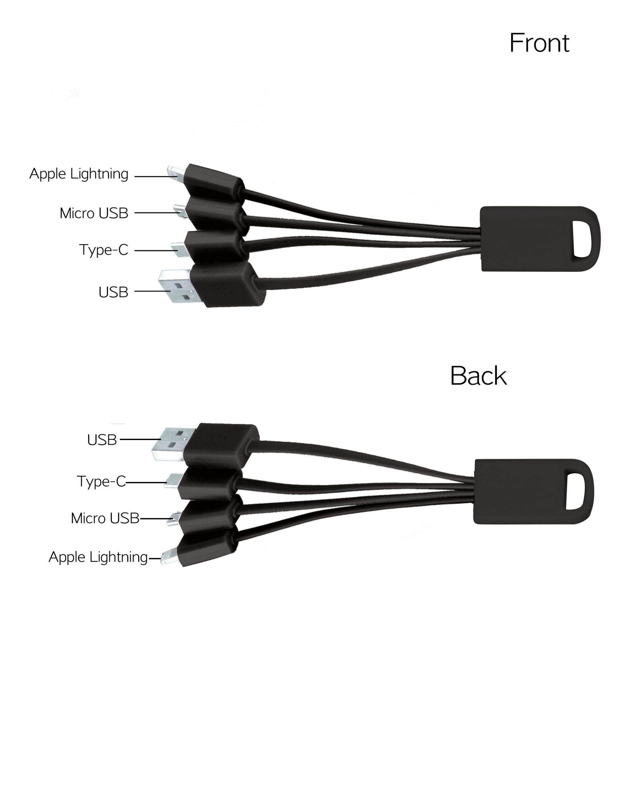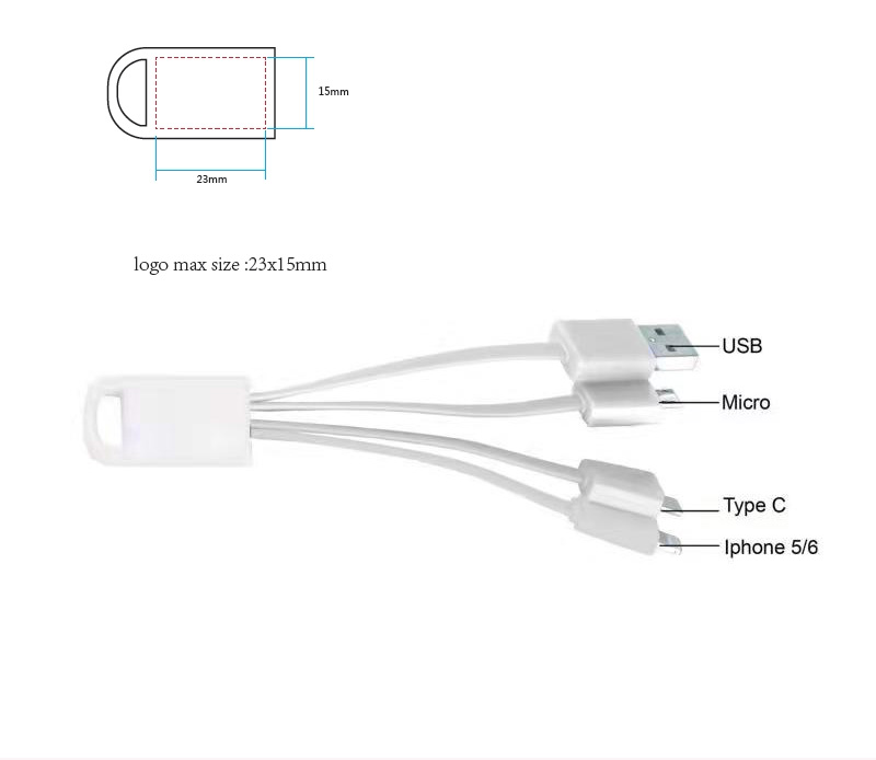 A small muti charging cable made from TPE, comes with USBA input and three outputs MicroUSB, Lightning, and USBC.