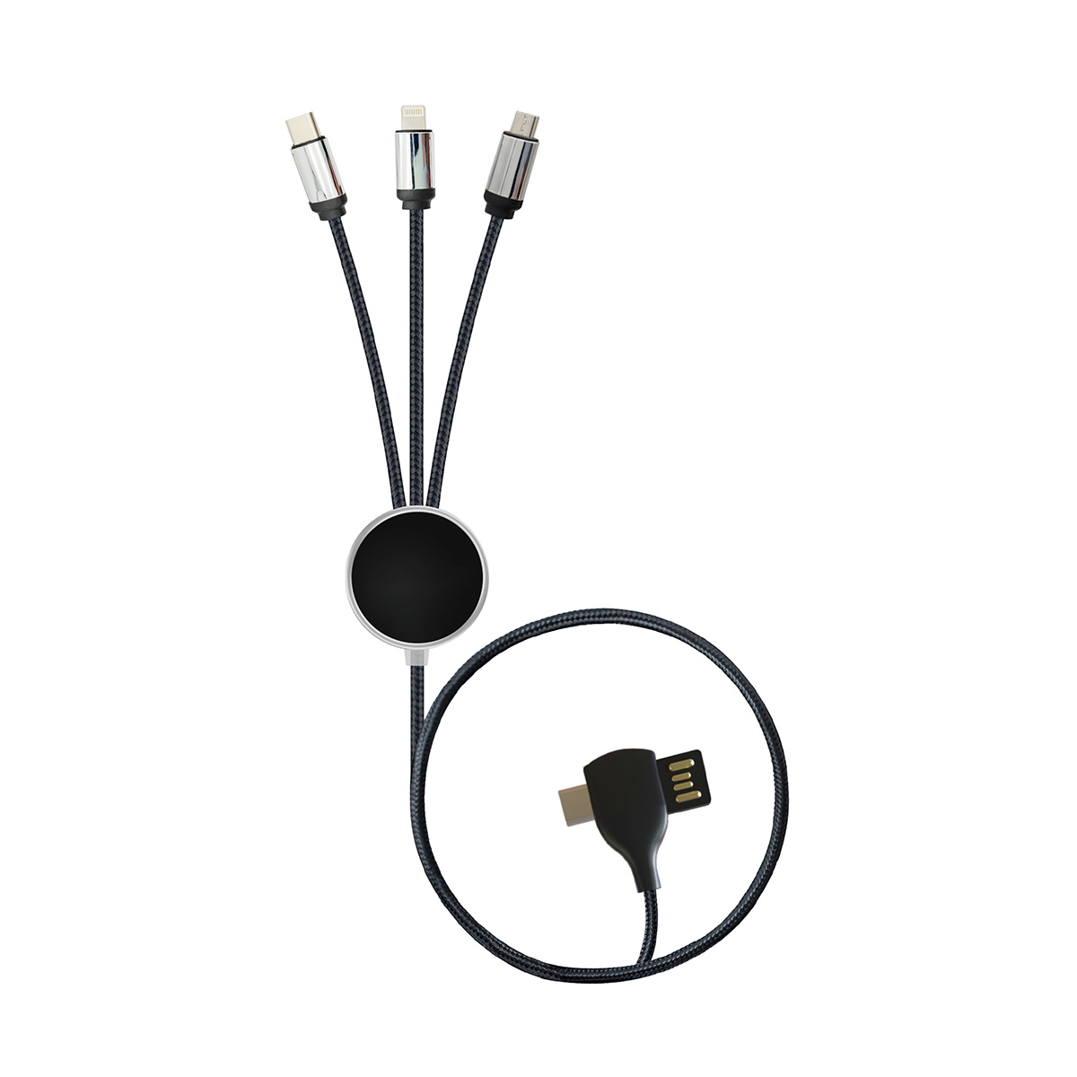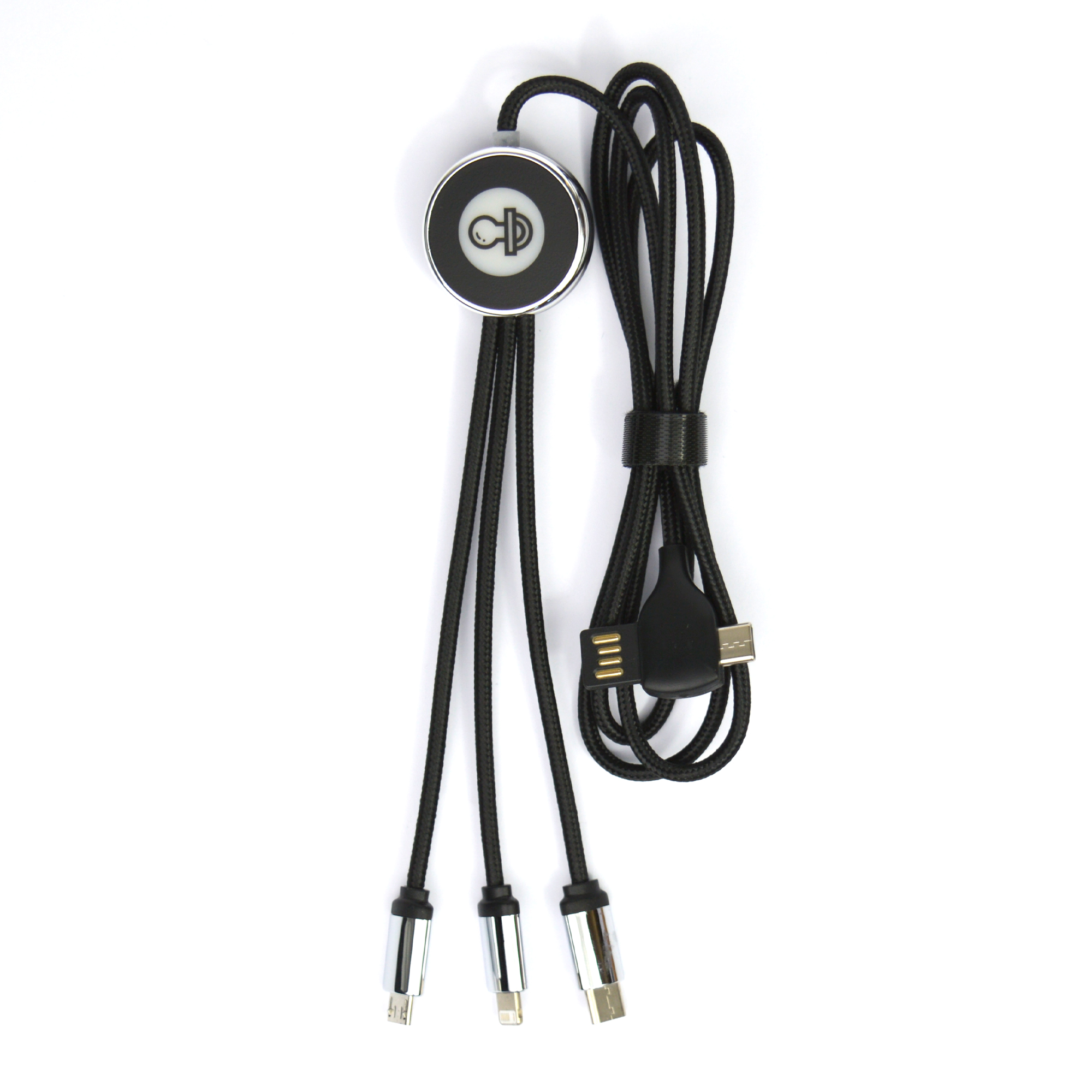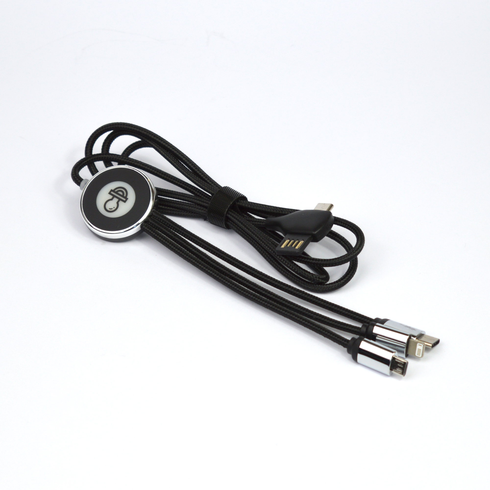 Multi-charging cable with antibacterial coating, comes with two inputs (USB A and USB C) and three outputs USB C, Micro USB and Lightning adapter. Engrave the cable to leave a light up logo.