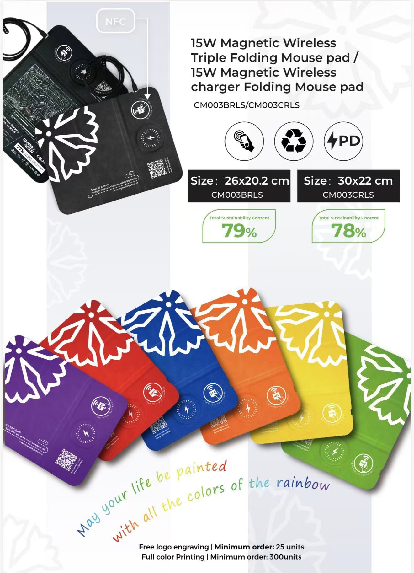The integrated wireless charging area supports fast charging for compatible smartphones, while the built-in NFC function allows instant access to digital content such as websites, contact details, or promotional pages with a simple tap. Ideal for corporate gifts, events, and brand promotions.