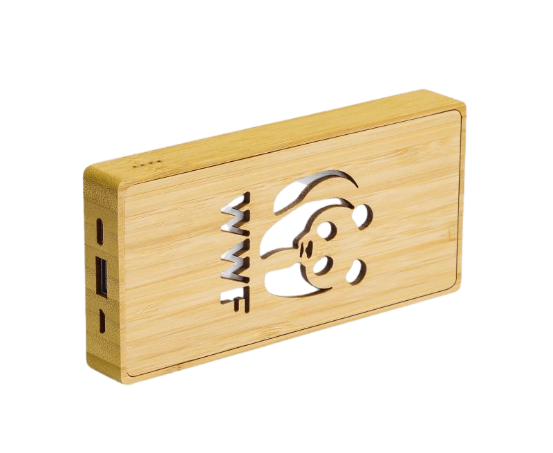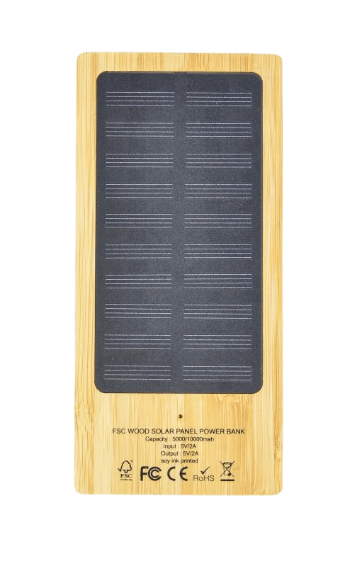 Solar powered power bank made from FSC approved bamboo, comes in 5000 mAh and 1000 mAh battery capacity.