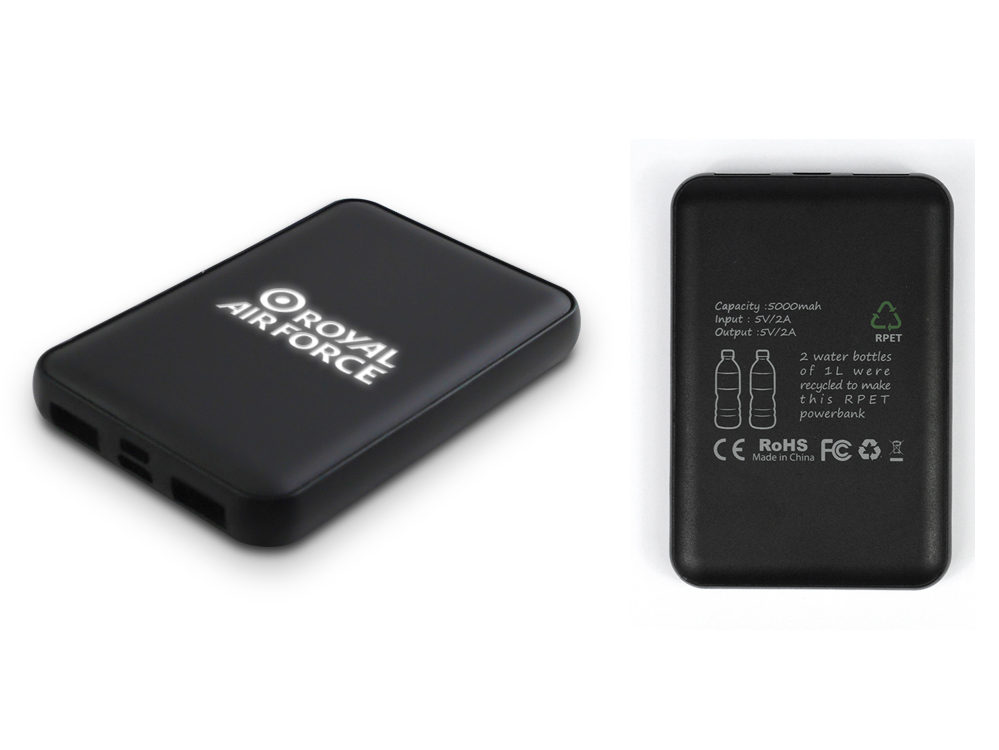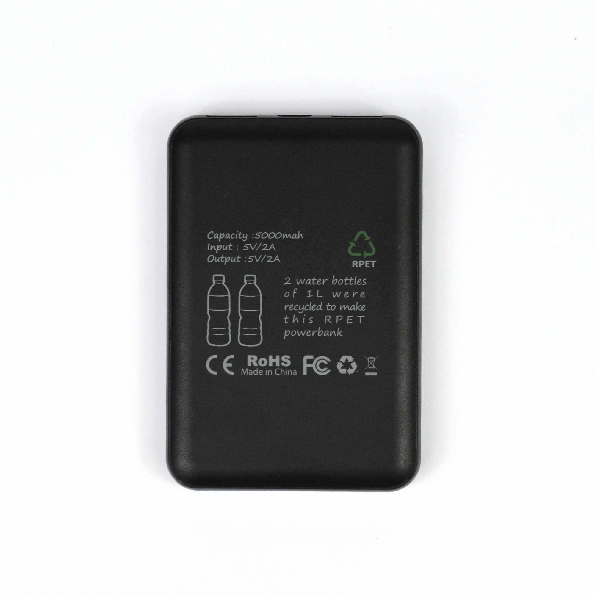Two 1L water bottles were recycled to make this rPET 5000mAh power bank. The branding on this power bank is LED light up logo and comes supplied in a kraft box.
