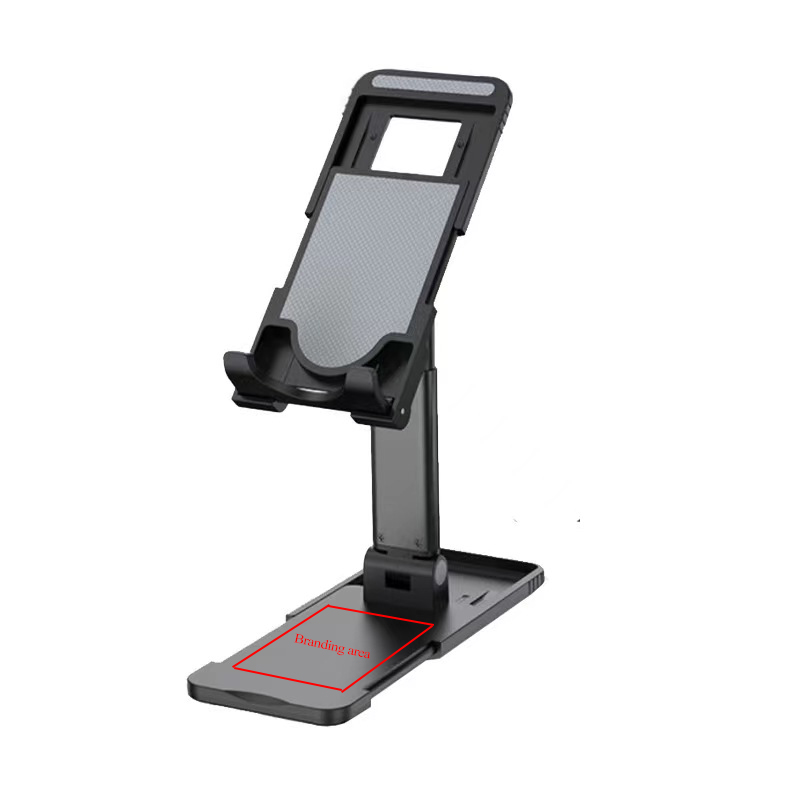 Foldable phone holder made from PC and ABS. The phone holder is available in black and white, printed on the base of the phone stand.