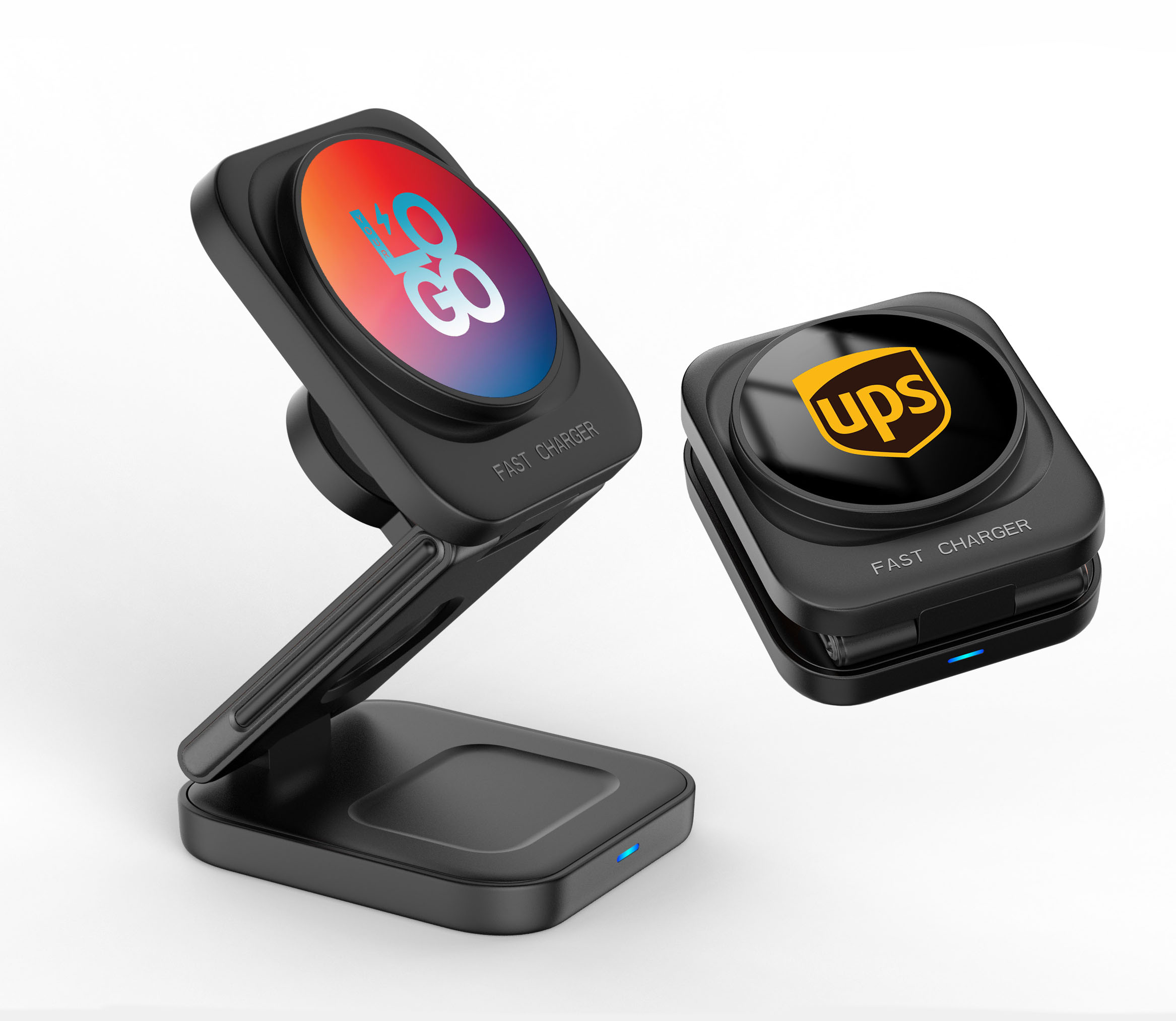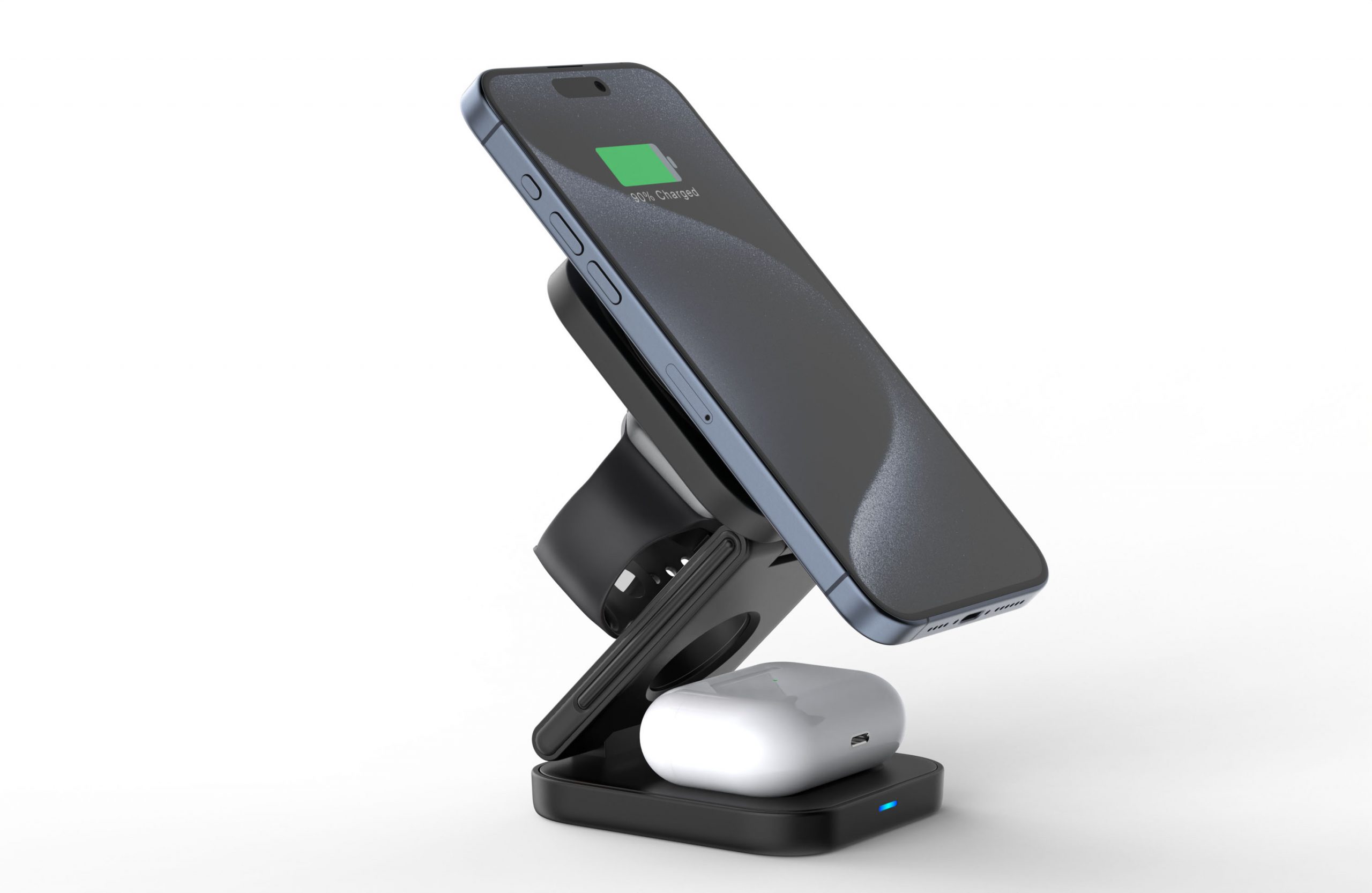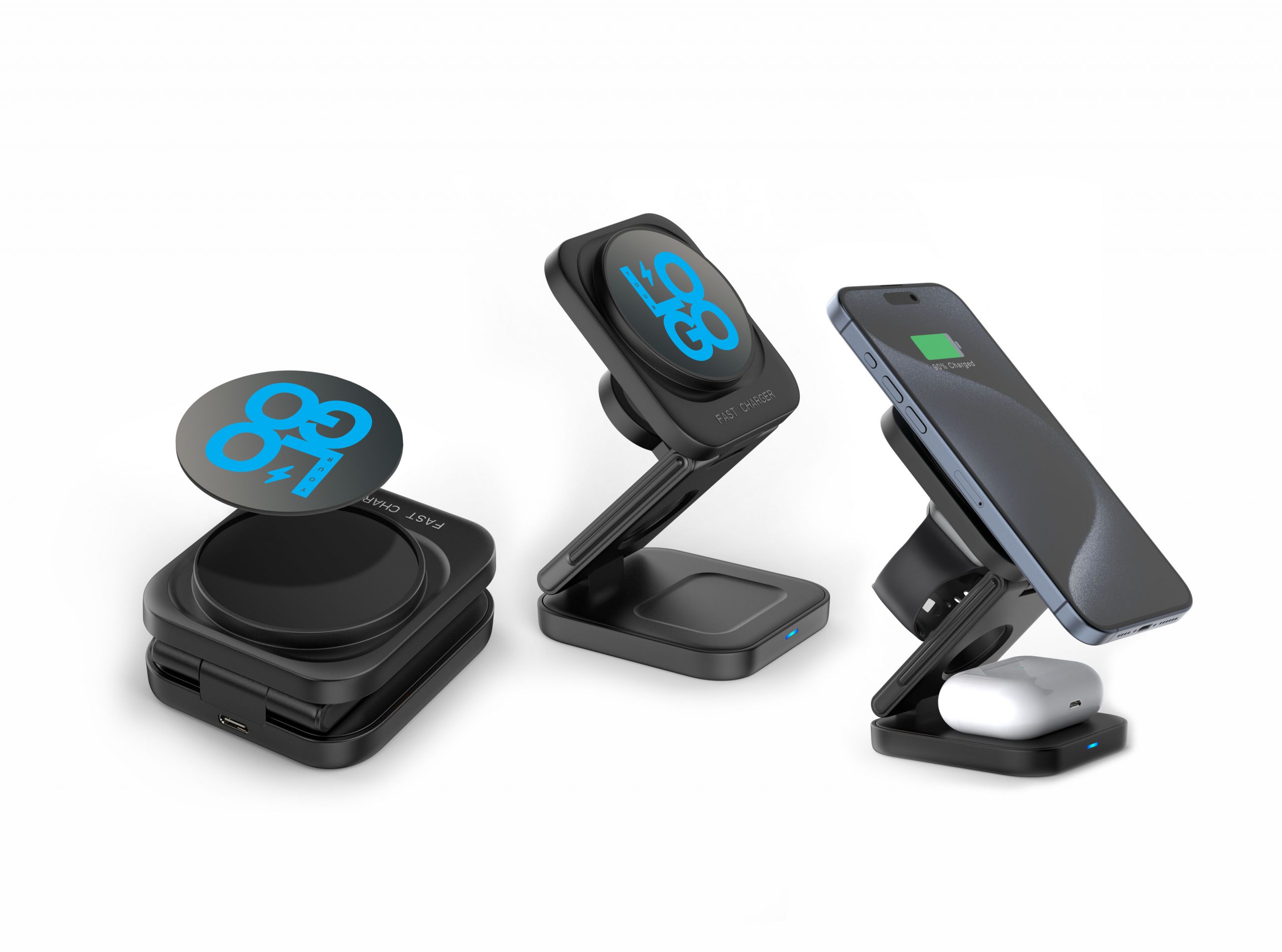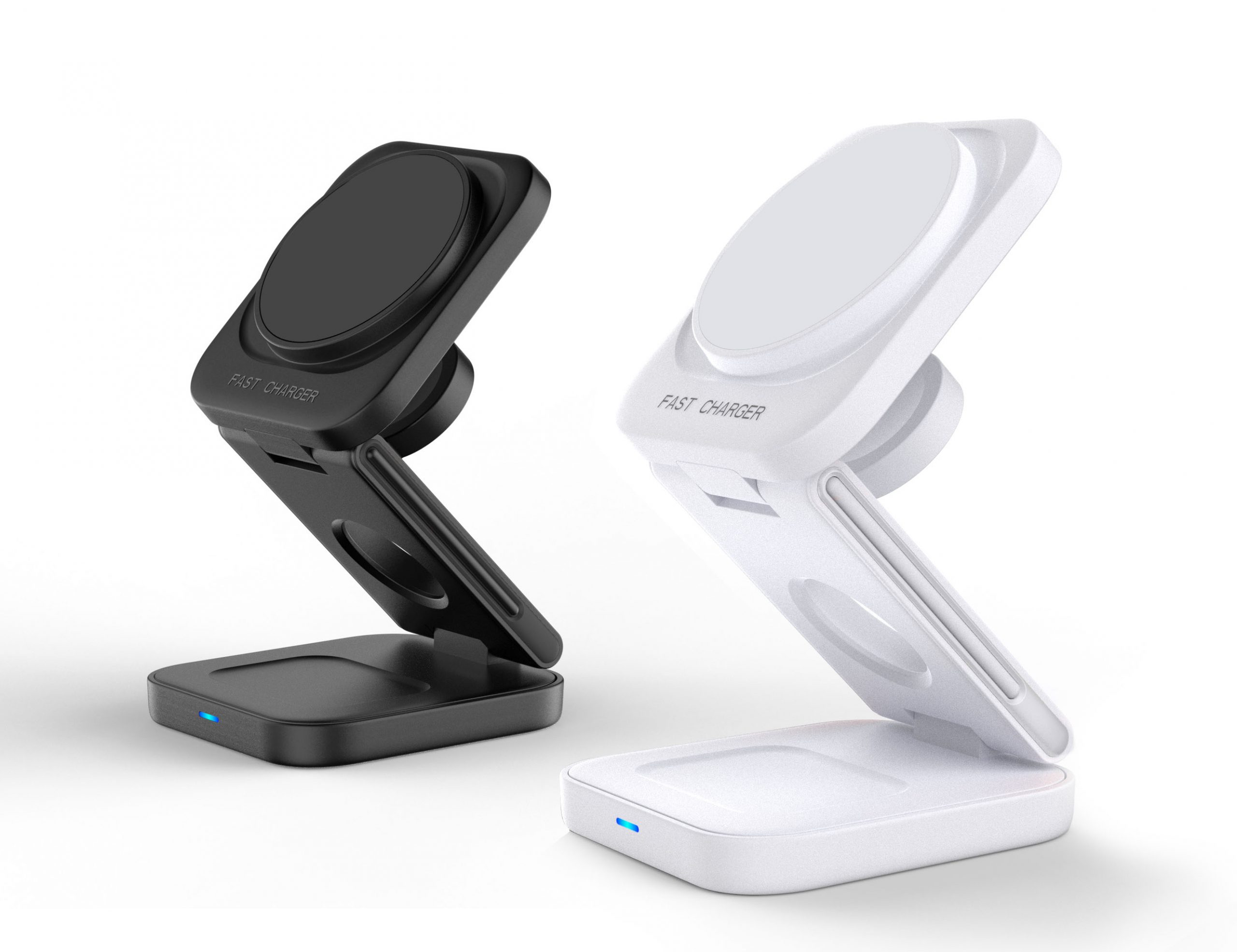 The 15W Folding Wireless Charging Phone Stand with MagSafe compatibility is a sleek and versatile solution for charging multiple devices at once. Designed for convenience, this compact stand allows you to charge up to three items simultaneously, making it ideal for keeping all your essentials powered and organized. The stand folds neatly, offering easy portability for travel or on-the-go use. With a powerful 15W wireless output, it efficiently charges compatible devices while serving as a sturdy stand, perfect for hands-free viewing in either portrait or landscape mode. This charging stand combines function with convenience, making it an ideal companion for those who value both style and efficiency.
