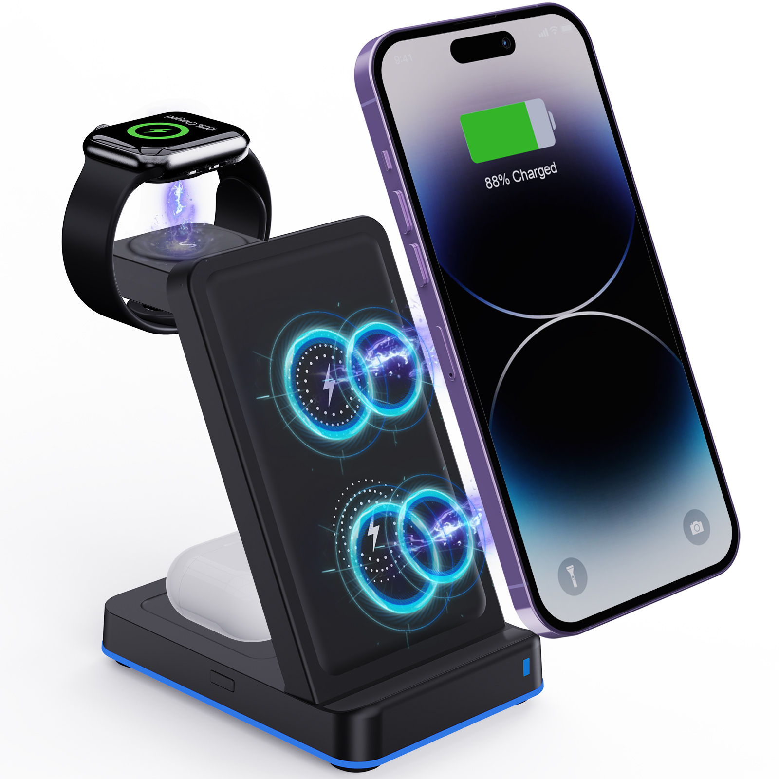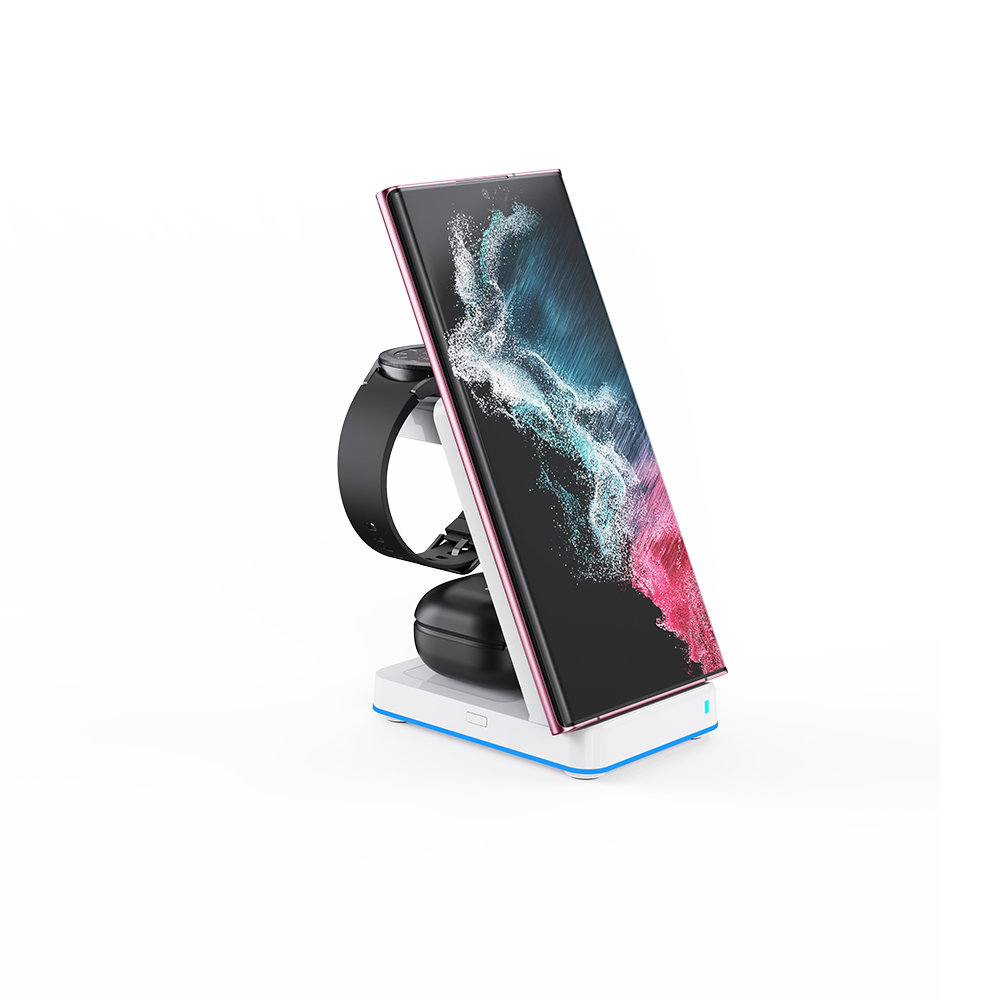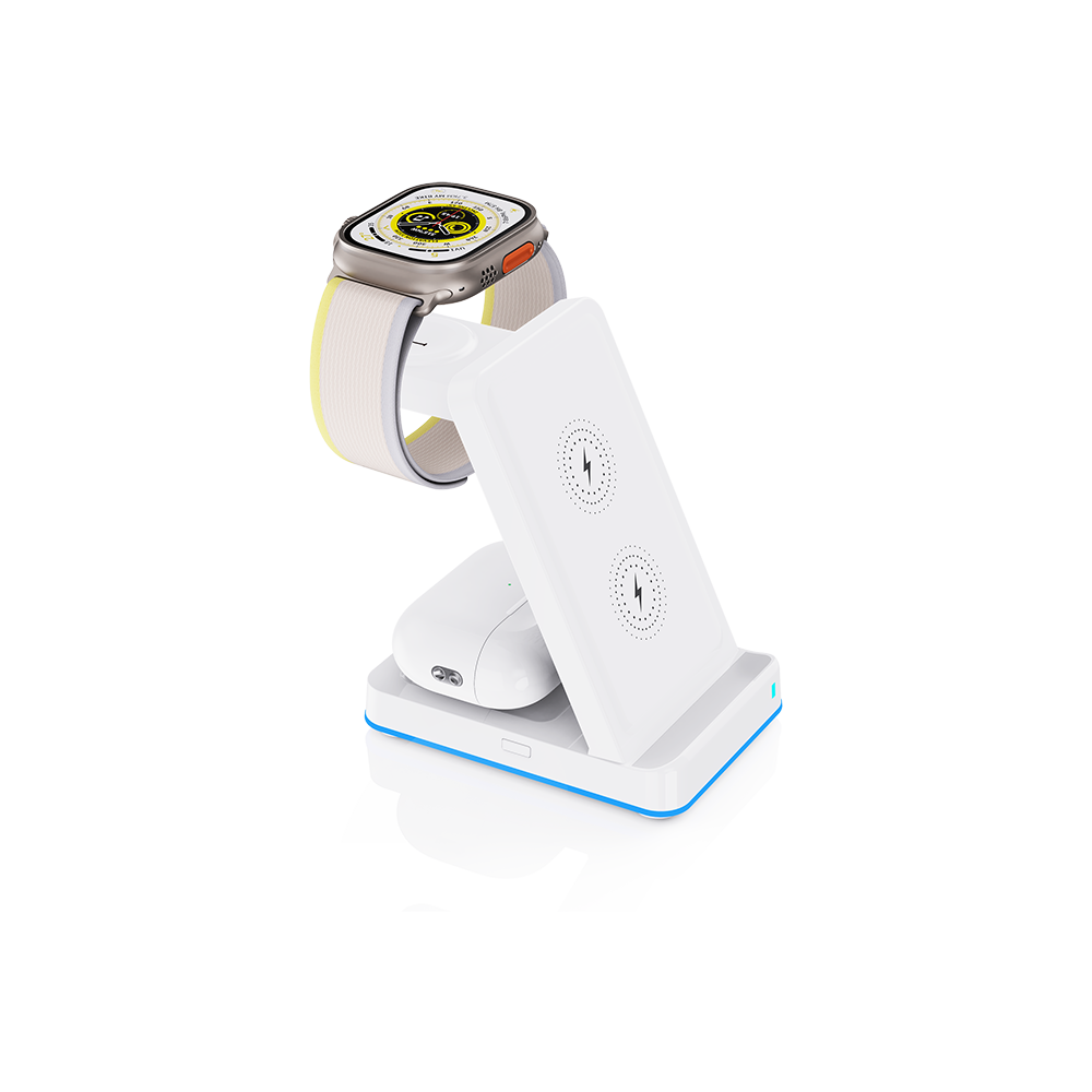 This 3-in-1 wireless charging stand is designed to power all your essentials in one sleek setup. Charge your smartphone, earbuds, and smartwatch simultaneously with fast, stable wireless charging—keeping your desk or nightstand clutter-free. The stand supports iPhone and other Qi-enabled phones, AirPods, and features a smart, space-saving design ideal for everyday use.